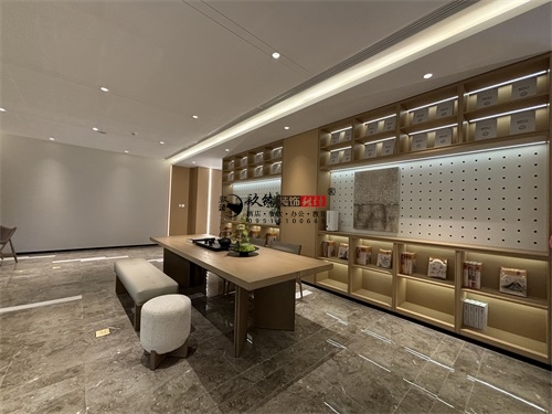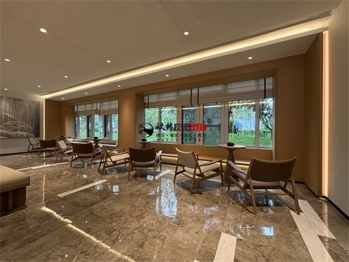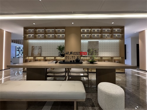 今天分享的是海原望远民生售楼部展厅装修设计实景,该家售楼部展厅装修设计方面主打的是轻奢自然风,精准打造出一个具有魅力的展厅形象。空间布局上,成品完美体现了售楼部展厅装修设计的功能优先级:靠窗区域做了“观景式洽谈区”,长条形卡座+小边几的组合,既利用窗外绿植弱化了商业属性,又通过嵌入式灯带营造出“家的松弛感”——这是银川装修公司镹臻常用的“场景代入法”,让客户在洽谈时提前感知“未来生活场景”。同时,分散式的座椅布局兼顾了私密性,避免了传统售楼部的拥挤感,也符合银川高端售楼部“低密度、舒适化”的设计趋势(如阅海湾壹号展厅的松弛感营造)。